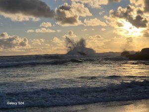 The waves pounded against huge rocks with a boom, the spray was spectacular and the sky was huge. A few surfers arrived and paddled out to sea. It was all mesmerising.